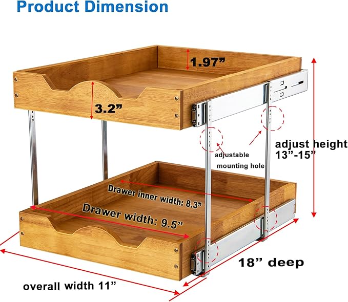 - This 2 tier pull out cabinet organizer overall size is 18" D * 11"W, the drawer width is 9.5" W, requires more than 11 " W net width cabinet opening,net width measure from the hinges , min cabinet deepth at least 19.5 inch. Measure your cabinet and choose the right size before making your decision.