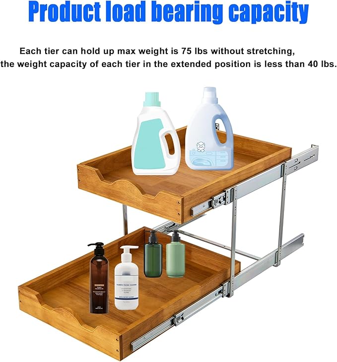 - Smooth And Quiet Movement. The exclusive glides we use are premium ball-bearing slides featuring heavy-load capacity and ultra quiet running for the cabinet. Each tier can hold up max weight is 75 lbs without stretching, the weight capacity of each tier in the extended position is less than 40 lbs.