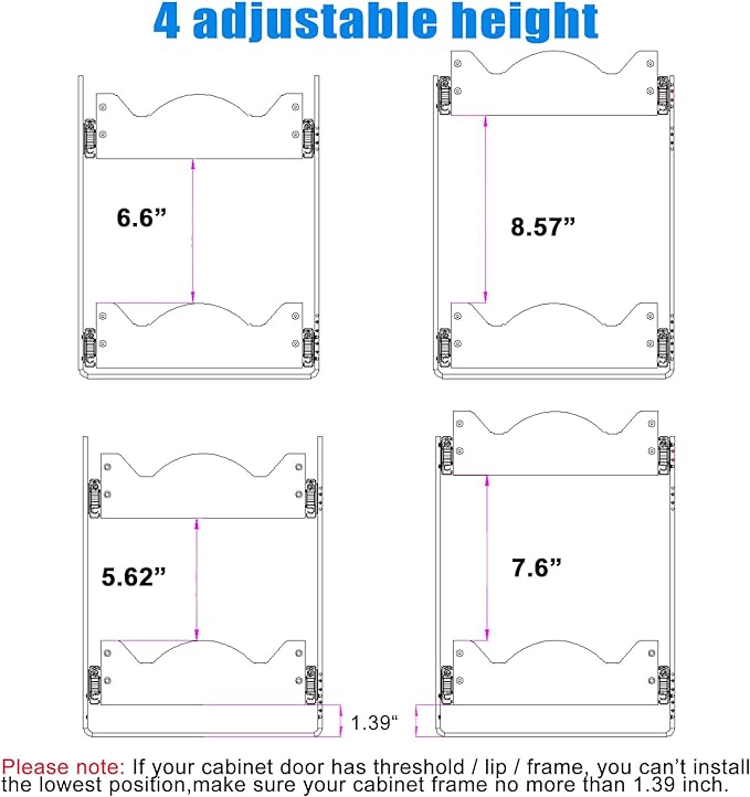 - Elegant And Classical Design. This pull-out cabinet organizer features a combined construction of oak wood and metal materials, adapting to various cabinets. 4 adjustable heights, with a minimum height of 13 inches and a maximum height of 15 inches.