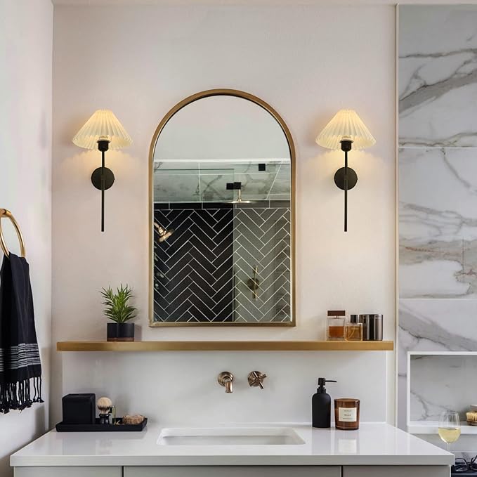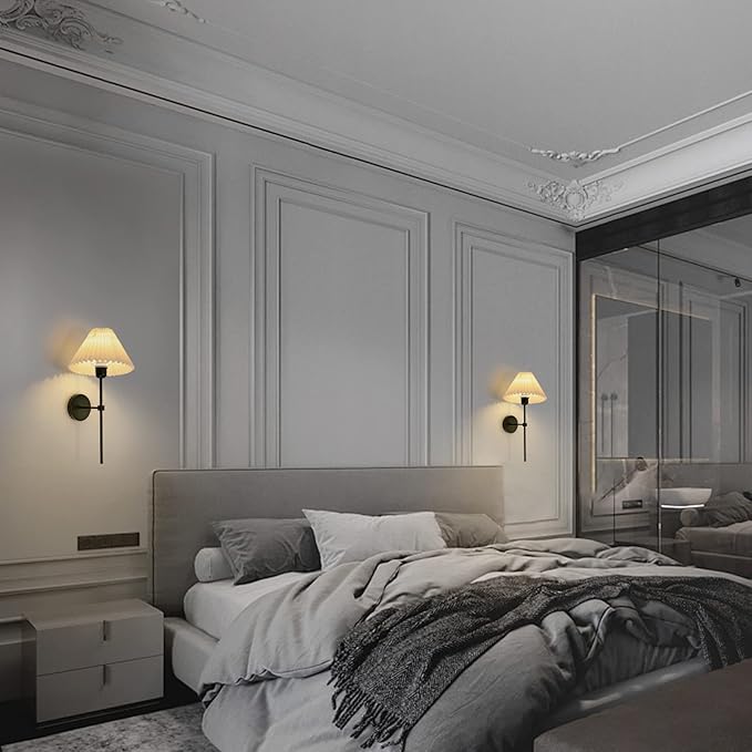 - 【Wide range of applications】Matte black finish with white pleated fabric shade, perfect as a bathroom vanity light, bedroom wall sconce. Suitable for sofas, mirrors and fireplaces, bedroom cabinets, staircases, etc. The classic fabric shade wall sconce complements the building by directing light upward, downward and outward, spreading it throughout the space and adding brilliance to your home.