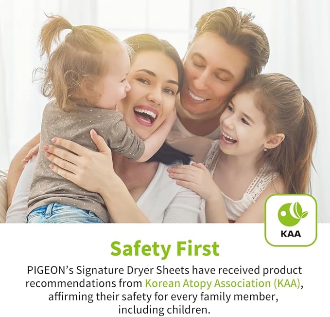 - Safe for All Family Members: Pigeon’s dryer sheets are accredited by the KAA(Korean Atopy Association). The whole family can use it with confidence!