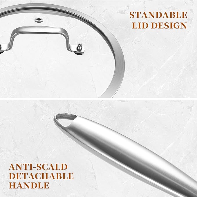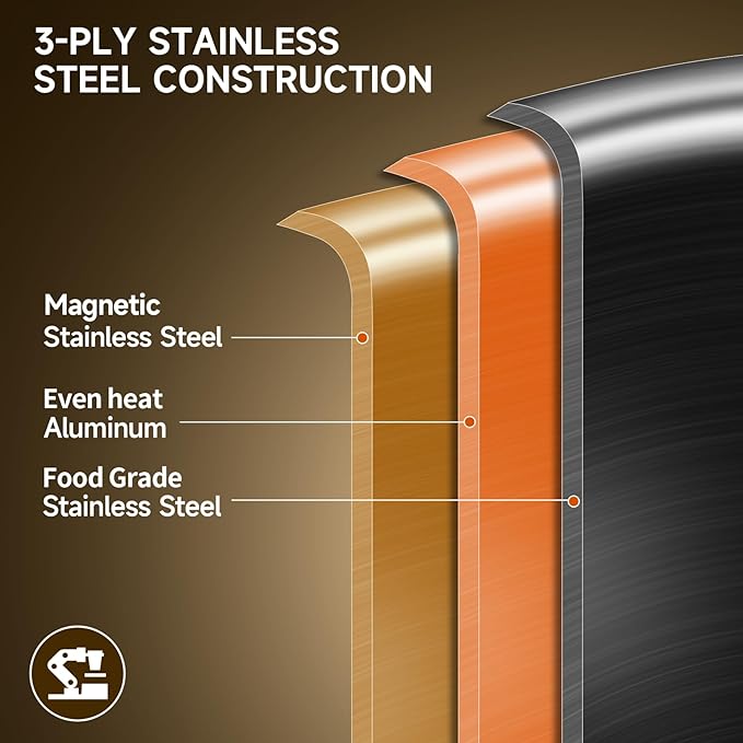 - Tri-Ply Clad:Made with a high pure aluminum core bonded together with 2 layers of durable stainless steel, excellent durability and even heat distribution,saved energy more than 20%.
