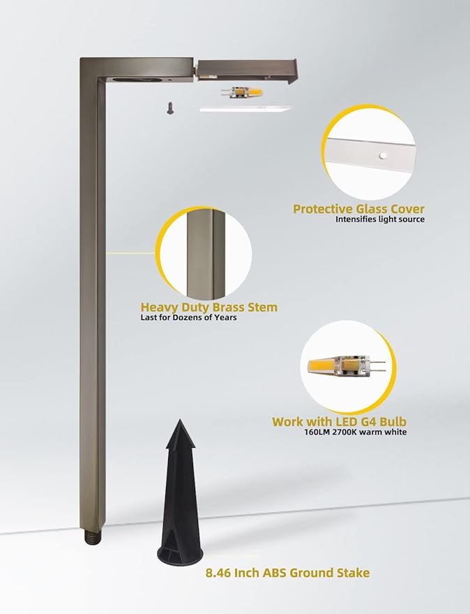 - Solid Heavy-Duty Structure: Cast brass L-shaped Path Light horizontal length is 5.25 inches and 21.87 inches tall. The antique bronze finish solid brass housing ensures excellent corrosion resistance and heat dissipation, while the fine workmanship makes it tougher, harder, and aesthetically pleasing. Robust seal with O-ring design and silicone plug at the bottom to stop moisture from entering, suitable for wet locations.