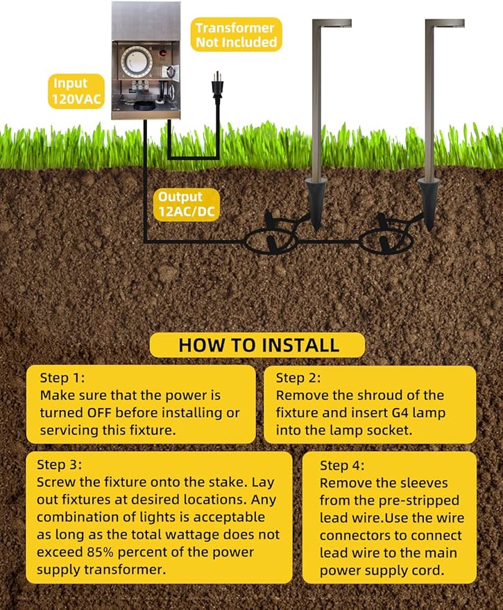 - Easy Installation: This sidewalk lights fixture with G4 bi-pin socket, compatible with G4 lamps up to 20W. One energy efficient 2W, CRI85+, 180LM, 2700K G4 LED bulb, 5.3-foot 18 AWG copper wire, one large PVC ground stake and two waterproof wire connectorsis included. Our professional-grade products are field-tested for durability and ease of installation. Even for those with no prior experience with low voltage outdoor pathway lights, installation is pretty simple.