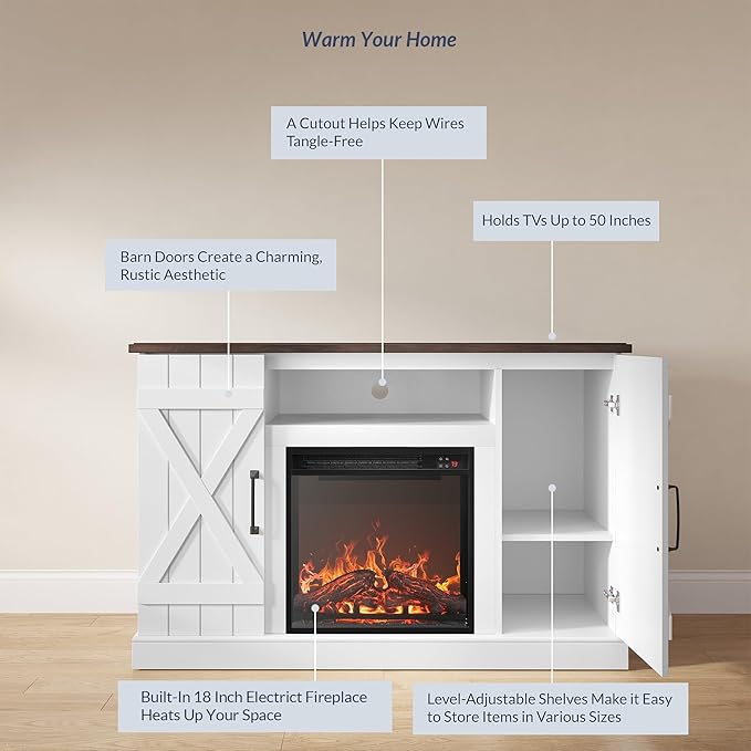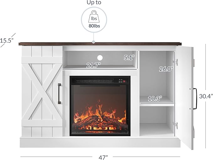 - [FIREPLACE TV STAND] Our console cabinet includes an 18" electric fireplace so you can enjoy cozy warmth without the smoke and ash. The 120 V, 1400 W fireplace can warm up spaces up to 400 square feet and measures 18"L x 5.07"W x 17.17"H.