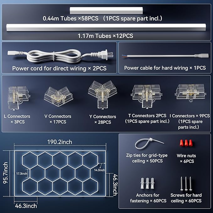 - More Accessories and Power cord--The whole set of car hexagon garage light including 58pcs 17.3inch light tubes(1pcs more than needed); 12pcs 46inch light tube. We also provided 2 power cords with plug which is 5ft long and 1 power cord for hard wired, this more quantity of power cords will make the electrical installation process easier and more convenient. Pls check the detail in the picture for more accessories.