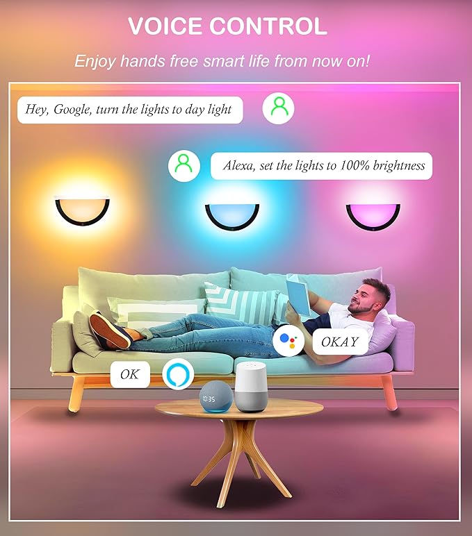 - 【Voice Control】 Work with Amazon Alexa, Google assistance(Hey, Google), you can set the brightness(NOTE:not compatible with physical dimmer switch, will affect service life), CCT and RGB color by voice control