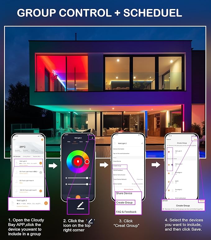 - 【Group and Remote Control】With cellphone in you hand you can control the light anywhere as long as connected to internet. You can group the lights for easy control and share with your family.