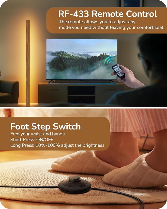 - [RF-433 Remote Control] This dimmable floor lamp can be easily controlled within 49ft using the RF-433 remote; choose from 7 color temperatures and 7 brightness levels, and quickly switch to 30% night light mode; memory function remembers your last setting
