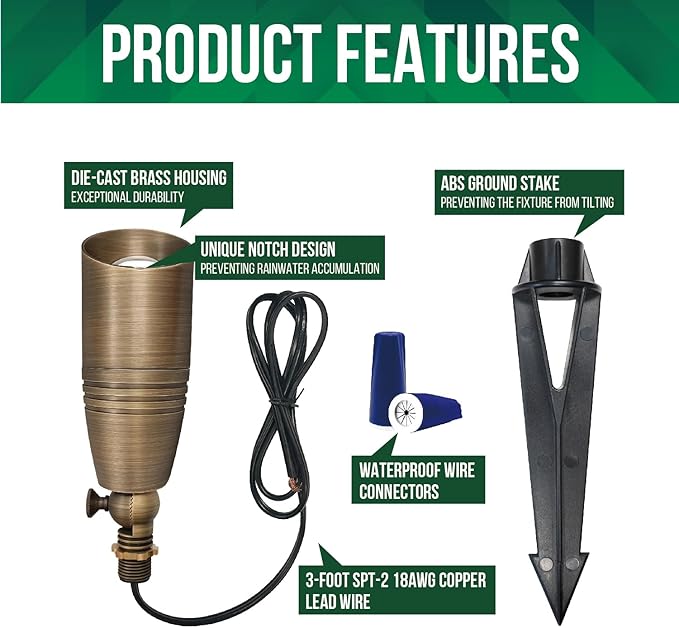 - Die-cast brass construction: This landscape spotlight is crafted from solid brass for durability and an elegant look. As it ages, a natural patina will develop, seamlessly integrating the lights into your landscape design.