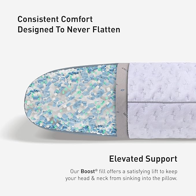 - Elevating Firmness with Boost Foam Core: Unlike traditional pillows that sink over time, the Boost Foam core in this pillow provides a spring-like feel that elevates rather than sinks. This dynamic firmness ensures you get the right amount of lift and support, reducing pressure points and enhancing overall sleep quality