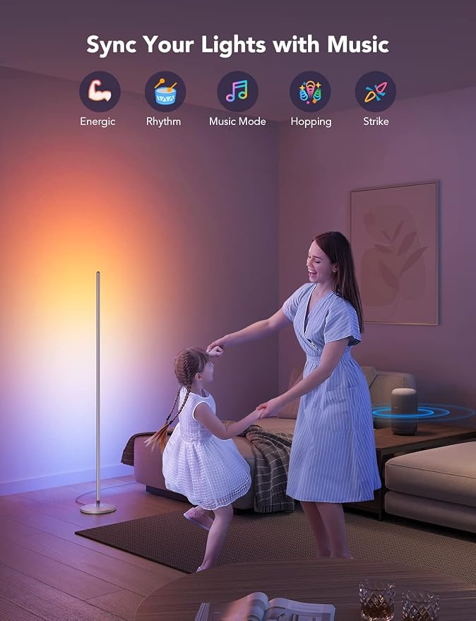 - Sync with Music: Elevate your movie, party, gaming time or listening session with our modern floor lamps for living room, the color and brightness of it will change simultaneously as music or gaming audio changes.