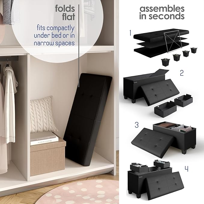 STORAGEBUD Storage Ottoman Bench with Bins, 30-in Storage Bench for Bedroom End of Bed, Folding Foot Rest Ottoman for Living Room Max 660lbs, Faux Leather Ottomans, Black