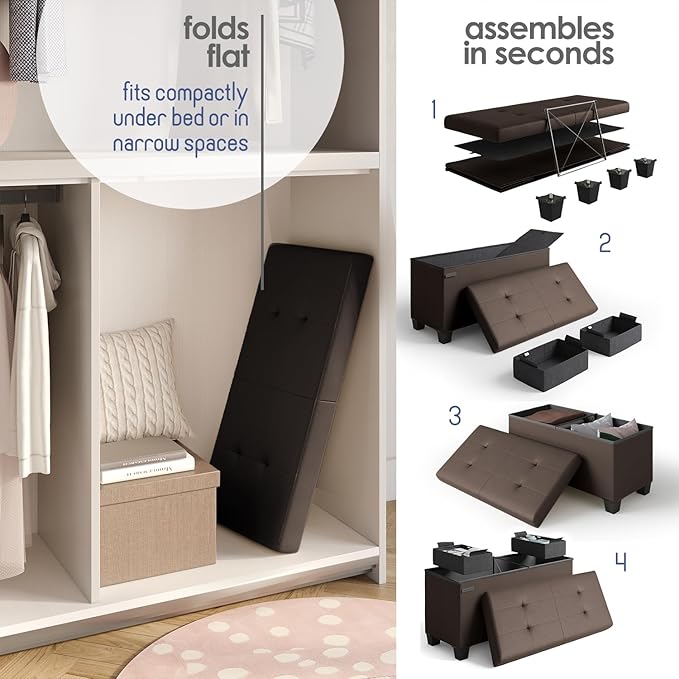 STORAGEBUD Storage Ottoman Bench with Bins, 30-in Storage Bench for Bedroom End of Bed, Folding Foot Rest Ottoman for Living Room Max 660lbs, Faux Leather Ottomans, Brown