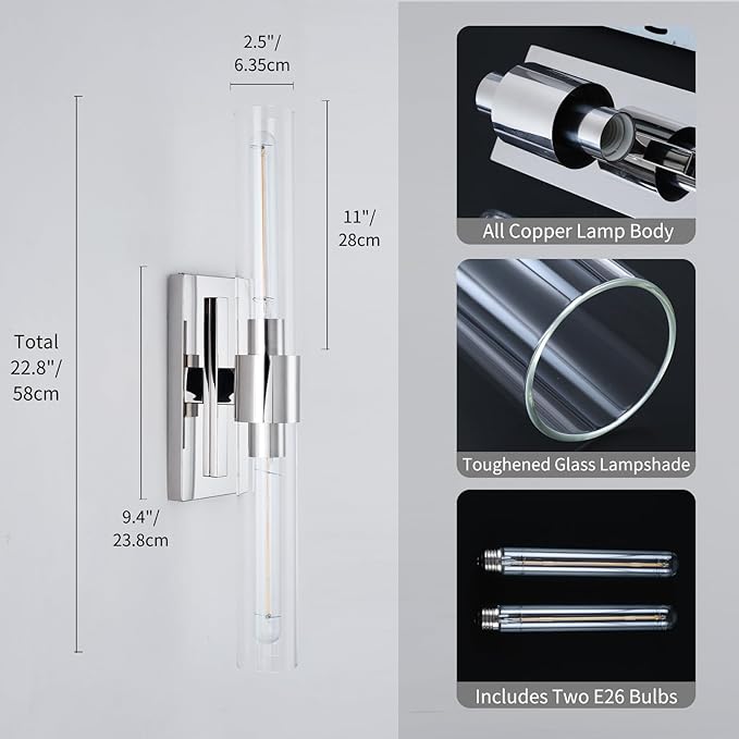 - Easy to install: The Wall sconce body is 24.8 inches. The base is 9.5 inches long * 4.3 inches wide* and 0.8 inches high. Package includes two 8.8-inch long LED bulbs, E26 base, 110V-240V voltage available. This long tubular bathroom fixture is easy to install in many different places for decoration. All hardware needed for installation is included in the package, just connect the wires and place the glass shade and bulbs.