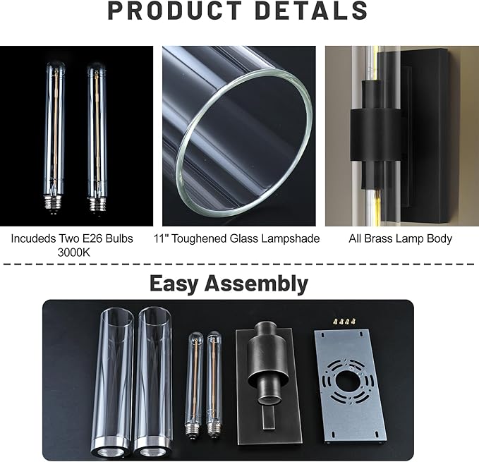 - High quality: The wall lamp frame and base are made of brass, which is stronger and more durable, and the surface coating is treated with anti-oxidation, not easy to rust and fade. The handmade long tube shade is made of clear hard glass with a high-light transmission. Perfect for indoor use.