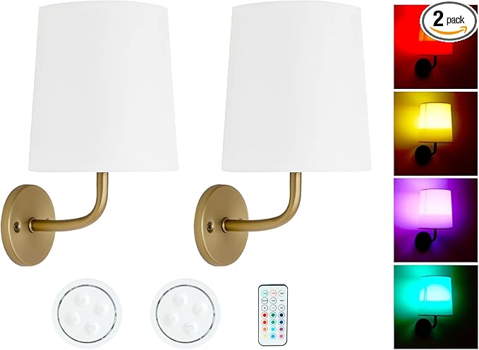 HEQIQEH Rustic Vintage Battery Operated RGB Wall Sconce Light Fixture with Remote Control, Flared Funnel Linen Fabric Shade Dimmable Nightstand Lamps for Bedroom Bedside, 2 Packs (Antique-2)