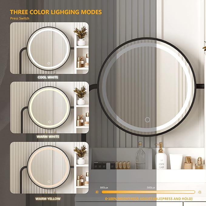 - đă360° Rotatable Dimming MirrorăThis make up vanity comes with a lighted mirror which can be 360° rotated. Charming gold vanity mirror with bright but not dazzle LED light, provide 3 color modes: warm yellow, warm white and cold white, this makeup vanity desk can meet your different needs, perfect for home, salon or live broadcast.