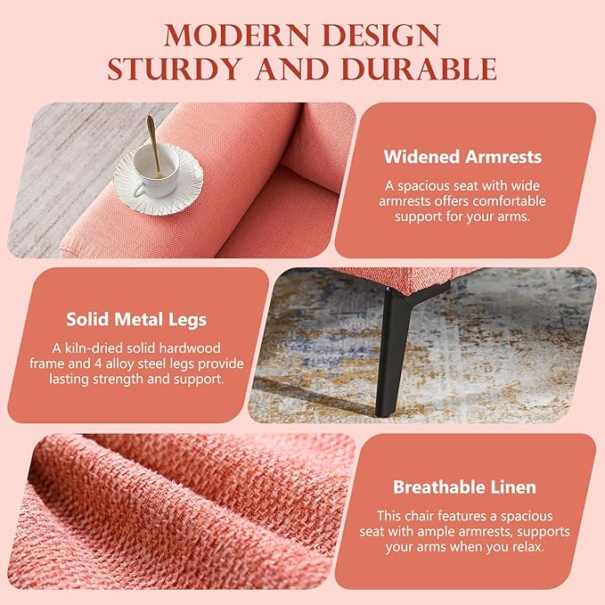 CDCASA Accent Chair, Linen Fabric Oversized Mid Century Modern Chair Set of 2, Comfy Upholstered Armchair Reading Accent Chairs Sofa Chairs for Bedroom Living Room, Coral Pink