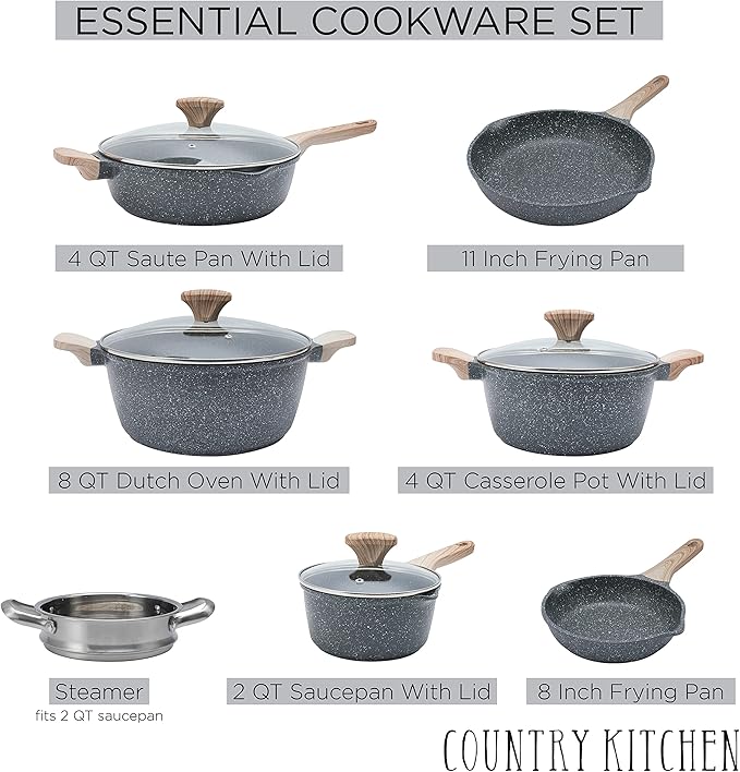 Country Kitchen Non-Stick Cast Aluminum Cookware Set - Durable Kitchen Cookware for Everyday Cooking, Grey, 11 Pc.