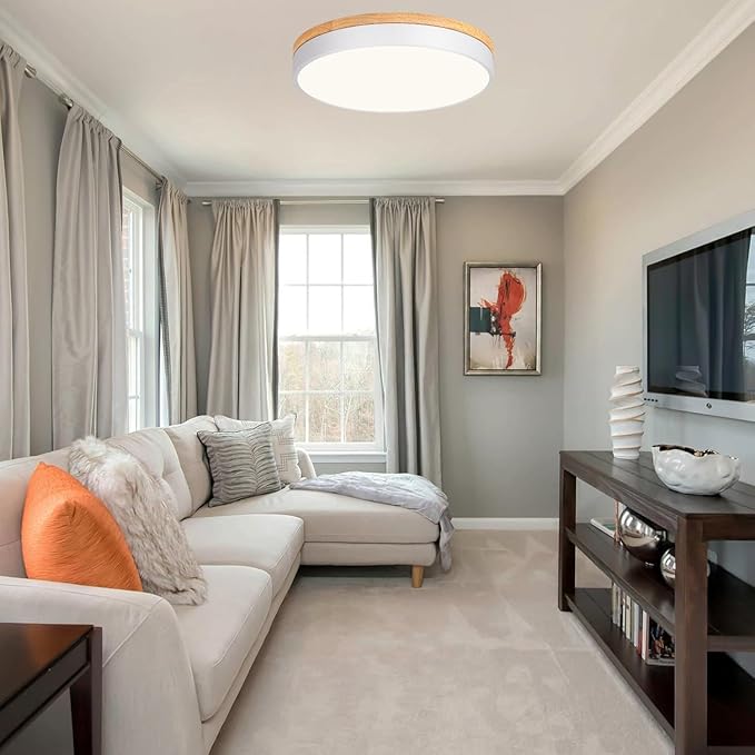 - Simple Design and Material: This 15.74 inch ceiling lamp made of hard metal and wood frame, acrylic light cover. The solid wood surface is glossy, uniform in color and clear texture. Acrylic lampshade with good light transmission performance, which can keep eyes from glare lighting. Inspired by Scandinavian design, simple but not oppressive