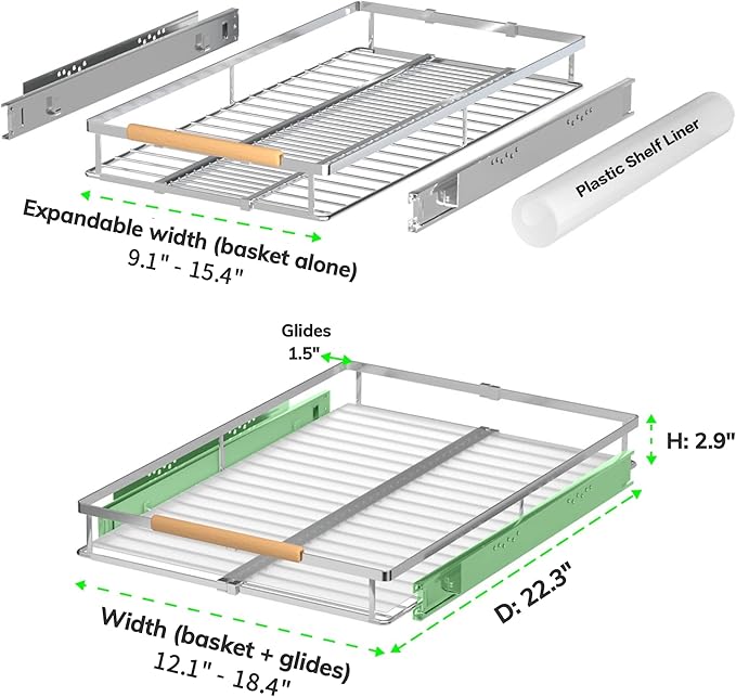 - EXPANDABLE DESIGN: This pull out cabitnet shelf is designed to fit in most cabinets. The width of the wire basket can be adjusted from 12.1“ to 18.4”. The new expandable design gives you a better experience and saves your space