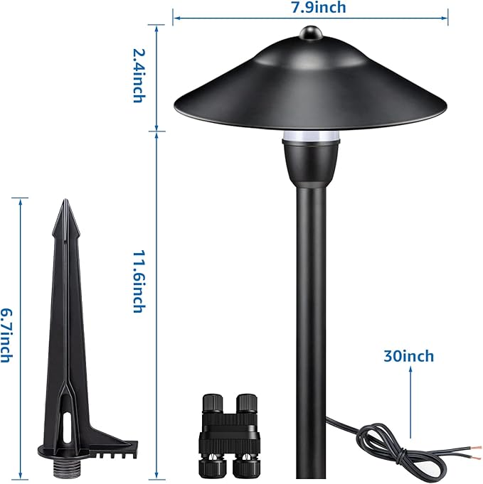 - 【Beautiful Look】With a classic "hat" look and a black finish, our LED path light looks beautiful yet unobtrusive in any landscape. With a 7.8" large shade, the path lighting is 360° downward light without any glare. This low voltage landscape light is perfect for lighting pathway, garden, yard, walkway, driveway, patio, etc.
