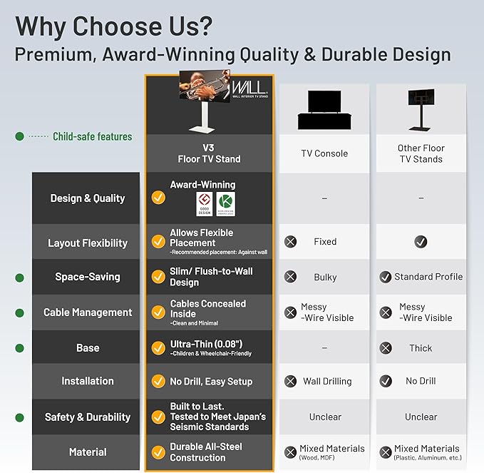 - 【MODERN DESIGN, NO DRILLING】This stylish, low-profile TV stand mount from Japan positions the TV directly against the wall, saving space. No need to drill in the wall, so it's perfect for apartments or renters. Messy cables are stored in the skinny back for a clean, sleek look. Contains more screws and is compatible with more TVs than the previous version. The 2-piece front panel hides support columns.
