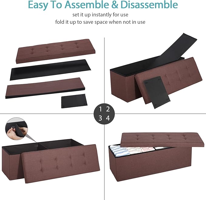 - 【Sturdy & Durable】This comfortable long storage ottoman is made of quality thick cardboard, strong and durable, has the load bearing capacity up to 660lbs. Breathable linen fabric, built-in thickened sponge, make the cushion is soft and comfortable. Brown unit you see everywhere and a perfect match to your couch or dining room chairs