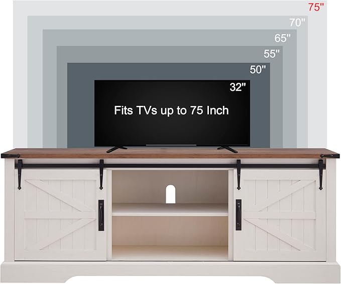 - DIMENSION: 66" W x 16"D x 25" H. Fits TVs up to 75 inches (farmhouse tv stand for 75 70 65 55 inch TVs etc.)