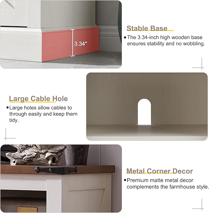 - MODERN FARMHOUSE or RUSTIC CLASSIC AESTHETIC: This TV entertainment stand perfectly combines modern, and rustic farmhouse style, a great way to add personality and charm to your living room. The interior adjustable shelves and 2 cable management holes behind the door help the easy organization and hiding wires