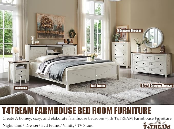 T4TREAM Nightstand with Charging Station, End Table, Side Table with 2 Drawers Storage Cabinet for Bedroom, Living Room, Farmhouse Design, Wood Rustic, Antique White