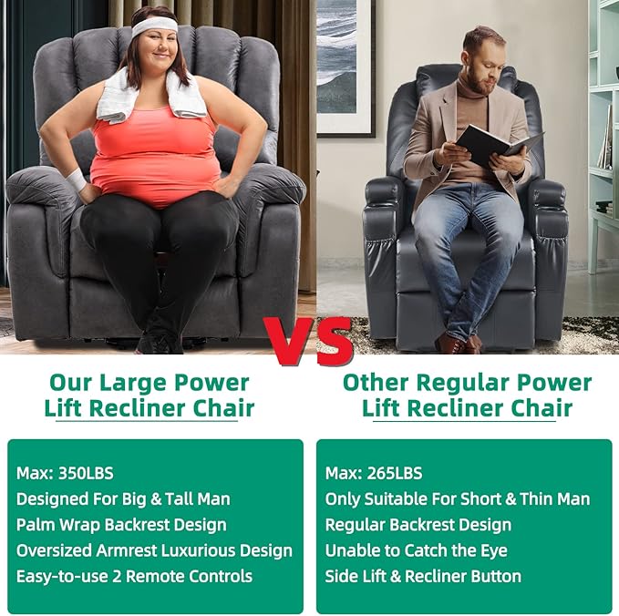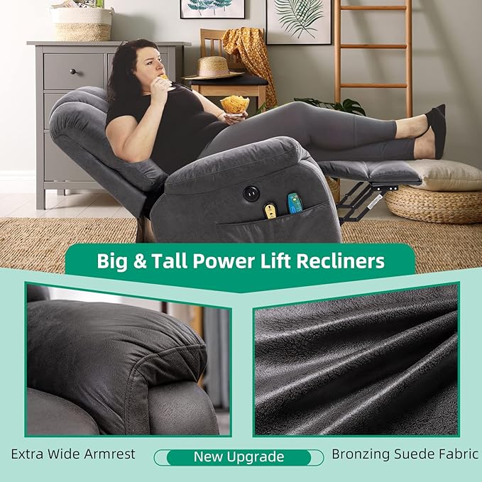 - 【Deeper Seat and Delicate Fabric】- This upgraded power lift chair is equipped with oversized and wider armrest, back and seat, which make it an ideal choice for people in bigger size. Overstuffed upholstery padded with high density sponge brings comfort, once you take a seat, you'll never want to get up. The bronzing suede fabric with a special process to bring a leather-like visual finish on the suede surface, soft to the touch, eco-friendly and breathable, wear-resistant and stain-resistant