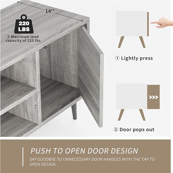 - 【Convenient Push-to-Open Cabinets】Features two spacious cabinets with an easy push-to-open mechanism (ejector + magnetic catch). Simply press the door to open the entertainment center effortlessly, and it securely seals upon closing – no handles needed