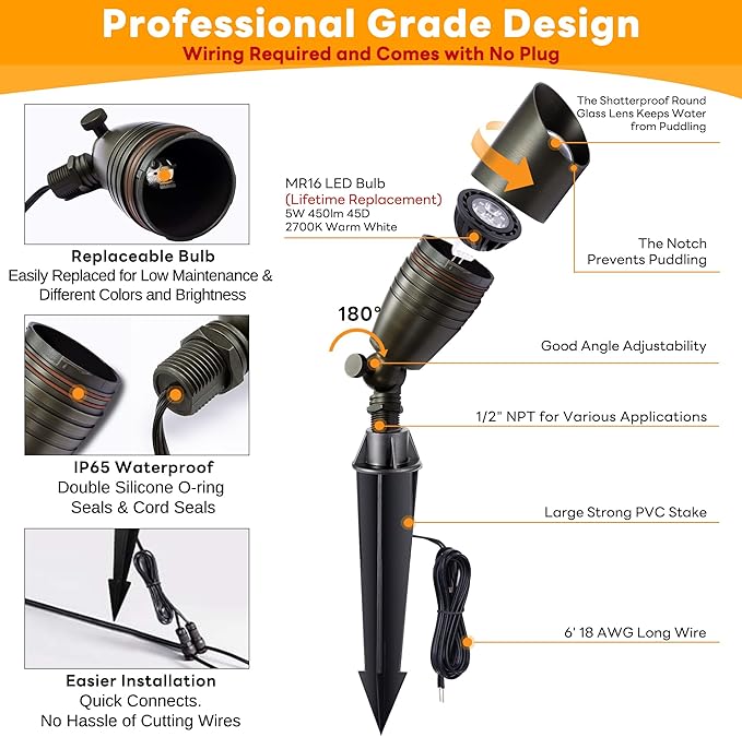 - ๐๐ซ๐ข๐ ๐ก๐ญ: Outdoor spotlight with a 5 watt LED MR16 bulb (450lm). Lights up exterior trees, walls, flags, and fountains up to 10-12 ft. 180ยฐ adjustable while the ground stake stays in place