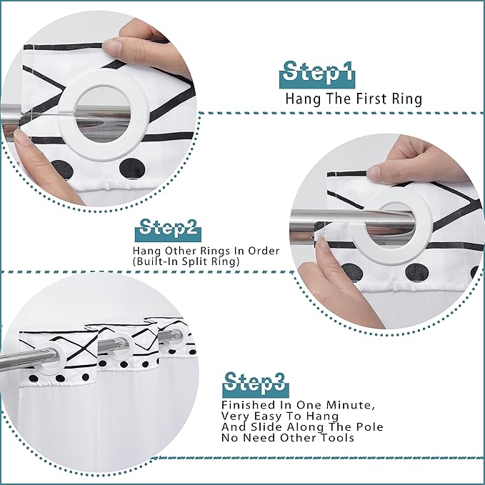 - SUPER EASY TO INSTALL : This shower curtains design with High Quality Flex On Rings that you can very easy to install it in one minute.Smart design will made it easier to hang and to slide along the pole.
