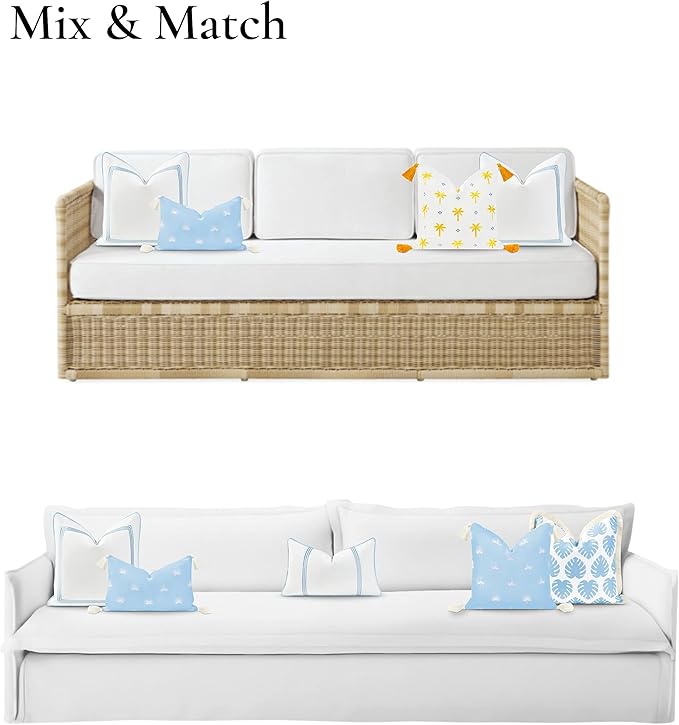 - Refined Coastal Design: Showcasing an embroidered palm leaf pattern against a baby blue backdrop and with playful contrast white tassels on the corners, this lumbar pillow cover adds the instant beach house effect to any home. Perfect for spring, summer, fall and coastal decor.