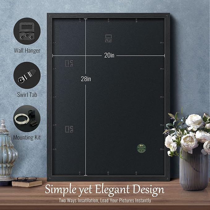 - PRODUCT FEATURES: The overall size is 29.8”x21.8” for Pictures 20x28 or 28x20, horizontal/vertical for table or wall display. Unlike others, special swirl tabs make the frame super easy to load pictures.