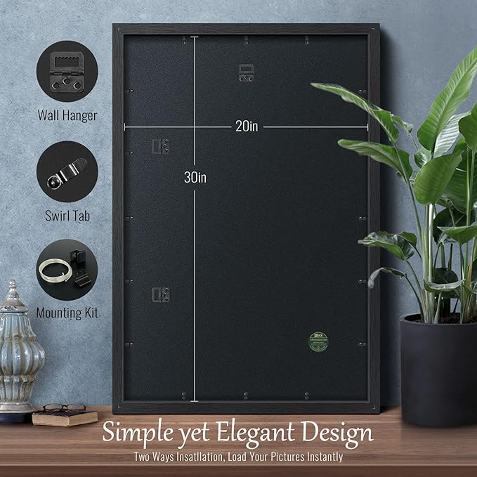 - PRODUCT FEATURES: The overall size is 31.8”x21.8” for Pictures 20x30 or 30x20, horizontal/vertical for table or wall display. Unlike others, special swirl tabs make the frame super easy to load pictures.
