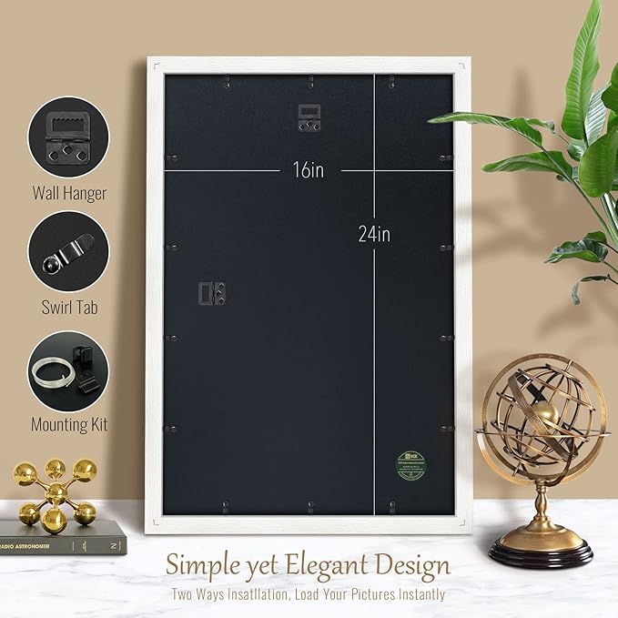 - PRODUCT FEATURES: The overall size is 25.8”x17.8” for Pictures 16x24 or 24x16, horizontal/vertical for table or wall display. Unlike others, special swirl tabs make the frame super easy to load pictures.
