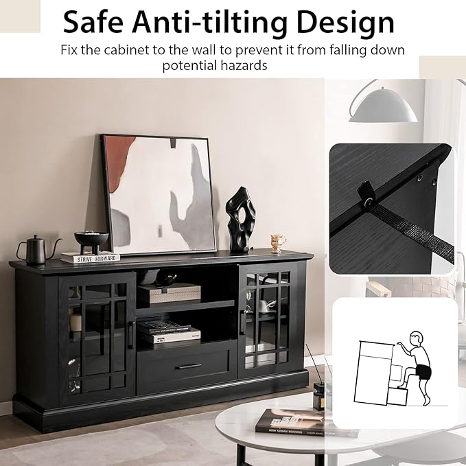 - [Multifunctional Storage Cabinet]: Our modern TV stand has exquisite glass door for a trendy farmhouse style, which makes it suitable for most decorations. You can use it not only in your living room as a TV stand, but also in your entrance hall or study as a storage or display cabinet. It will be a charming addition wherever you put it.