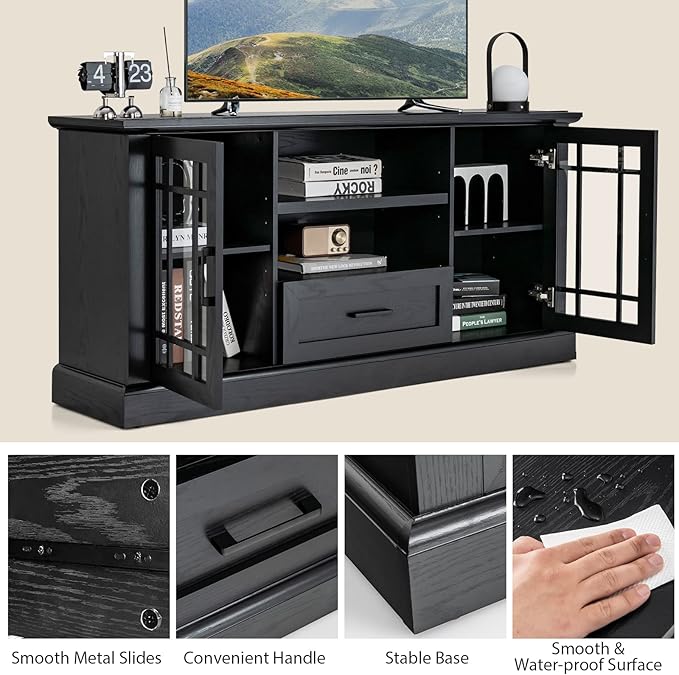 Tangkula Farmhouse TV Stand for TV up to 70 Inch, Tall Media Console Table w/2 Glass Doors, Entertainment Center w/Cubbies & Drawer, Storage Cabinet or Sideboard Buffet for Living Room (Black)