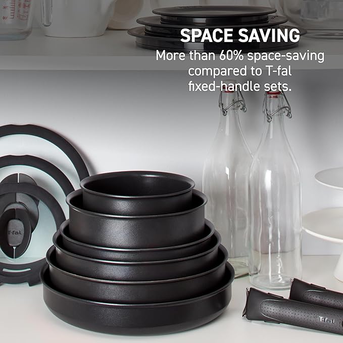 - ๐๐๐ฑ๐ข๐ฆ๐ข๐ณ๐ ๐๐จ๐ฎ๐ซ ๐๐ก๐๐ฅ๐ ๐๐ฉ๐๐๐: Gift the joy of space efficiency! Stackable design saves up to 60% more space compared to T-fal fixed handle sets. This all-in-one set for cooking, baking, and serving is best for small kitchens, RVs, and other limited spaces.