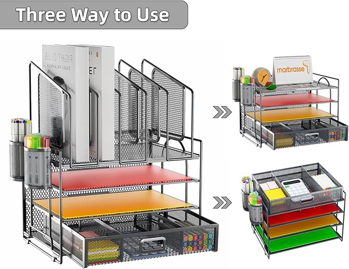 - 【Multifunctional Desk organizer】Marbrasse upgrade desktop file organizer has vertical and horizontal storage space – 4 sliding trays +5 vertical sorters +3 compartments drawer+ additional 2 pen holders . Upright section has five 3" Compartments for magazines, bill, file, book. Three types of use to meet your various office needs!!