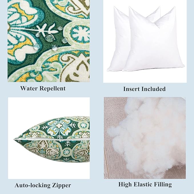 FUNHOME Outdoor Indoor Throw Pillows 18”x18”, Set of 2 Decorative Throw Pillows with Inserts, All Weather Water-Repellent Square Pillows for Bed, Couch, Sofa and Patio Furniture-Green Medal