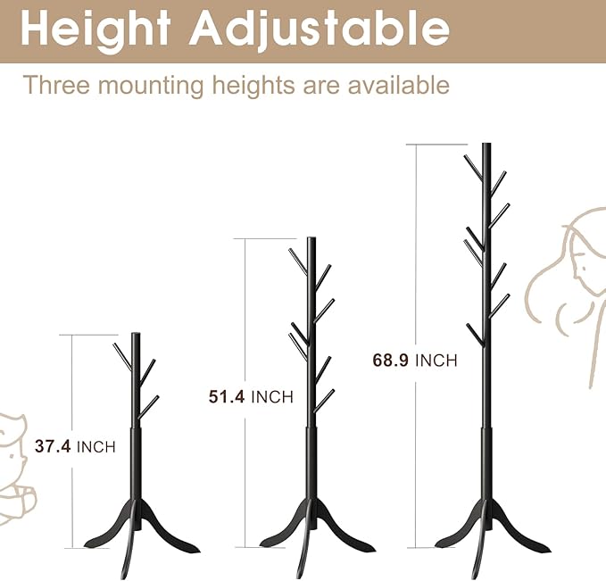 - 【Adjustable Height】The height of the coat rack is composed of three sections, allowing for three different height configurations. You can assemble it according to your needs, with heights of 37.4 inches, 51.4 inches, or 68.9 inches