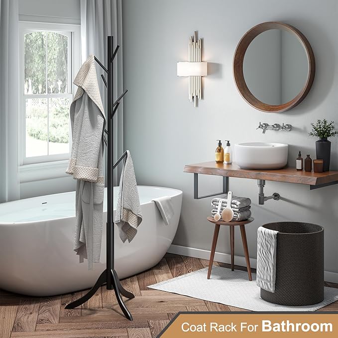Coat Rack Freestanding, Coat Stands Entryway, Bamboo Coat Rack Hat Hanger 8 Hook for Jacket, Purse, Scarf Rack, Umbrella Tree Stand (Black)