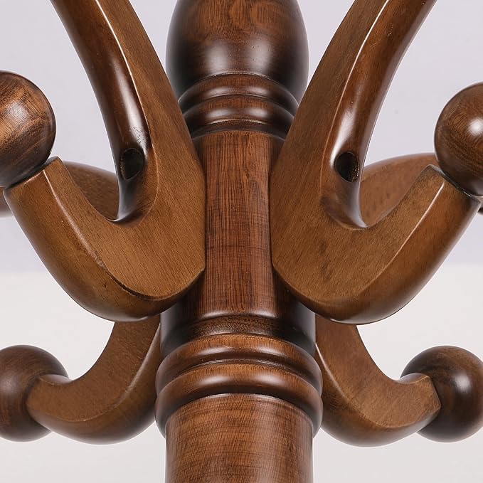 - 【Heavy Duty Construction-Extremely Stable】: This wood coat rack stand has thickened solid 3-legged base supports on the bottom for added stability and perfect balance, so it will not fall off even when shaken and can support up to 160 pounds (each hooks can hold up to 20lbs). The wood coat tree is extremely sturdy and strong enough to support coats, hats, scarves, briefcases, bags, backpack, winter jackets.
