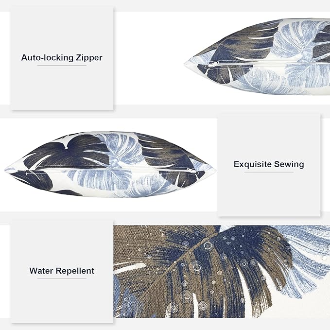 Pack of 2 Patio Throw Pillow Covers ONLY, Water Repellent Cushion Cases 20x20 Inch, Square Pillowcases for Outdoor Couch Decoration, Monstera Blue
