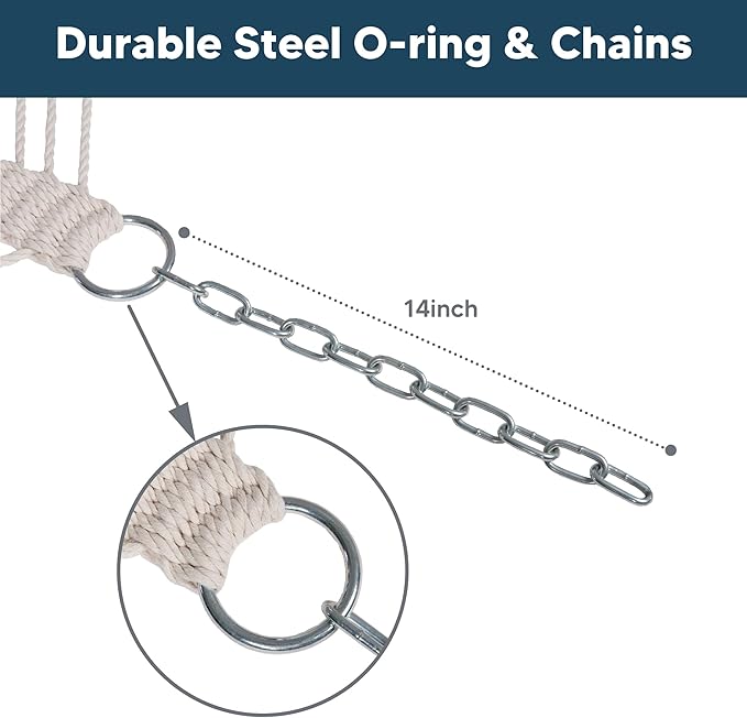 - Handcrafted Ropes: The heavy duty ropes are hand-woven with comfortable, long-lasting thread twists done by hammock artisans. 18 strong ropes are connected together and woven into a beautiful triangle pattern, which attaches to O-shaped steel ring